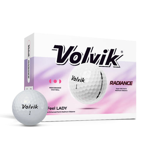 • Volvik Radiance golf balls and packaging on a pink background