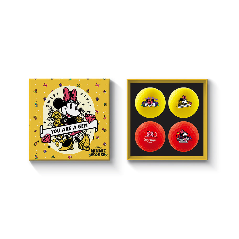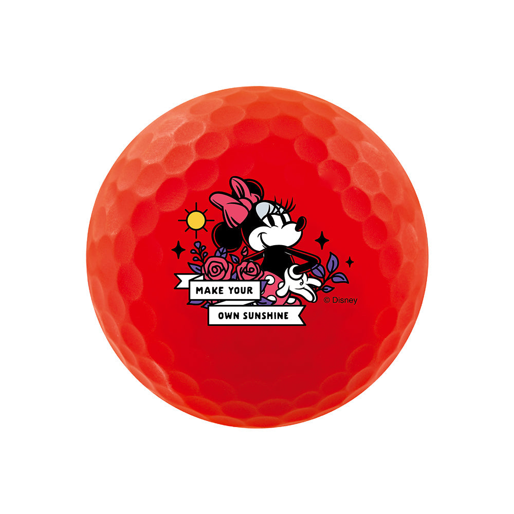 - Radiant Minnie Mouse Artwork: Four Minnie Mouse designs on red and yellow golf balls.