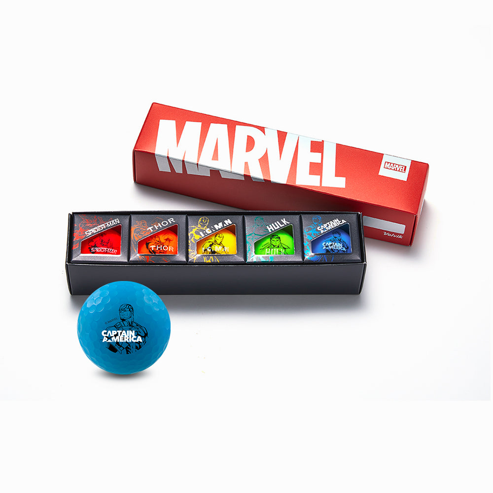 Marvel x Volvik Vivid 5-ball pack includes Iron Man, Spider-Man, Hulk, Captain America, and Thor.